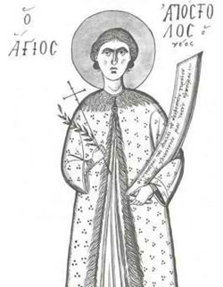 Ἀνδρικῷ φρονήματι, ἐν νεαρᾷ ἡλικίᾳ, διαπρέπον ἔνδοξε, ὡς στρατιώτης τοῦ Λόγου, ᾔσχυνας, τῶν ἐναντίων τάς ἐπινοίας, ἤθλησας, μέχρι θανάτου γενναιοφρόνως· διά τοῦτό σε τιμῶμεν, Μεγαλομάρτυς Χριστοῦ Ἀπόστολε.