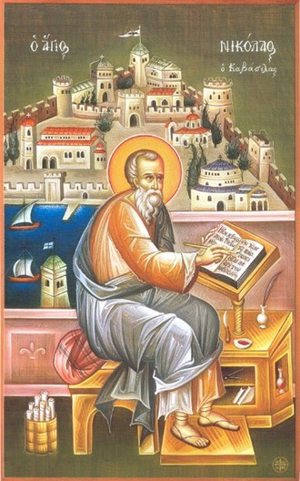Ὅσιος Νικόλαος Καβάσιλας ἐγεννήθηκε στή Θεσσαλονίκη κατά τό 1322 ἢ 1323 καί τό πατρικό ἐπώνυμό του ἦταν Χαμαετός. Ἡ ἐπιφανής οἰκογένειά του, προερχόμενη πιθανῶς ἀπό τήν Ἤπειρο, ἀνέδειξε πολλές ἀξιόλογες προσωπικότητες ἀπό τόν 14ο αἰώνα καί ἔπειτα.