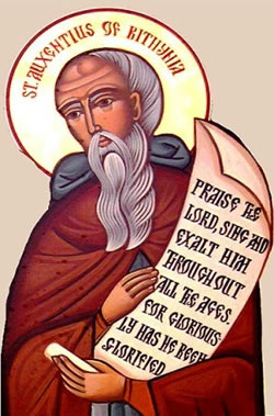 Κατηγλαϊσμένος ταῖς ἀρεταῖς, ὤφθης ἐν τῶ βίῳ, θεοφόρε περιφανής, ἄιγλῃ εὐσεβείας, καί χάριτι θαυμάτων, Αὐξέντιε ῥυθμίζων, τούς προσιόντας σοι.
