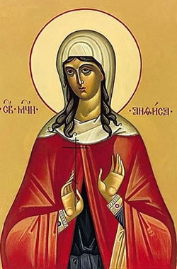 Ὁσία Ἀνθούσα, ἡ βασίλισσα, ἦταν θυγατέρα τοῦ αὐτοκράτορος Κωνσταντίνου Ε’ τοῦ Κοπρώνυμου (741-775 μ.Χ.) καί τῆς τρίτης συζύγου του Εὐδοκίας. Μετά τό θάνατο τοῦ πατέρα της διαμοίρασε ὅλα της τά ὑπάρχοντα στούς φτωχούς, σέ ἐκκλησίες καί ἱδρύματα καί ἔγινε μητέρα πολλῶν ὀρφανῶν καί προστάτιδα χηρῶν. Μολονότι δέχθηκε πολλές παρακλήσεις καί πιέσθηκε ἀπό τήν εὐσεβέστατη αὐγούστα Εἰρήνη τήν Ἀθηναία (797 – 802 μ.Χ.) νά μείνει μαζί της καί νά συμβασιλεύσει, δέν ἀποδέχθηκε.