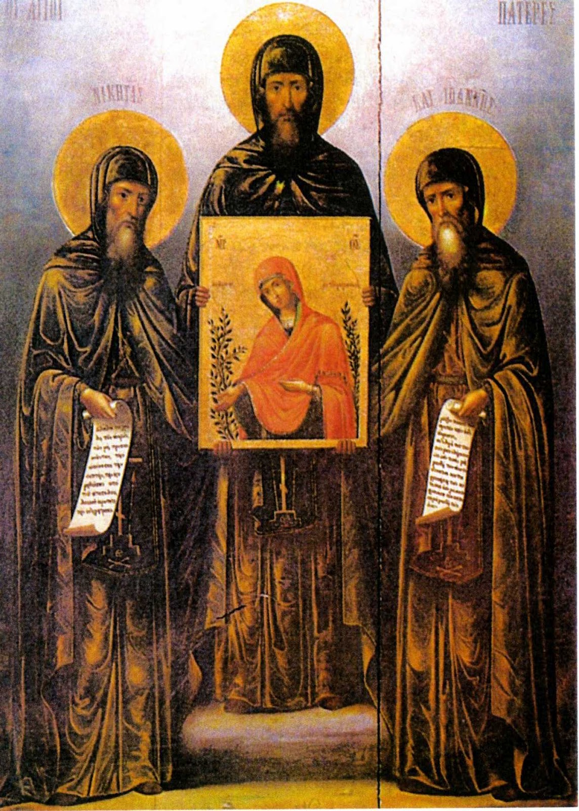 ἱ Ὅσιοι Πατέρες μας Ἰωάννης, Ἰωσήφ καί Νικήτας κατάγονταν ἀπό τήν Χίο καί ἔζησαν κατά τόν 11ο αἰώνα μ.Χ. Ἀσκητεύοντας ἐπί τοῦ Προβατείου Ὄρους τῆς νήσου τῆς Χίου, εὑρῆκαν μία ἡμέρα πάνω σέ δένδρο μυρσίνης κρεμάμενη εἰκόνα τῆς Θεοτόκου, τήν ὁποία, ἀφοῦ παρέλαβαν, τοποθέτησαν ἐντός ναΐσκου, πού ἀνήγειραν γιά τό σκοπό αὐτό. Ἀργότερα, μέ τή συνδρομή τοῦ αὐτοκράτορος Κωνσταντίνου τοῦ Μονομάχου (1042 – 1054), καί στή συνέχεια, τῆς ἀδελφῆς του αὐτοκράτειρας Ζωῆς, ἀνηγέρθη μεγαλοπρεπής ἡ Νέα Μονή, ἡ ὁποία προικίσθηκε μέ κτήματα καί ἀφιερώματα καί κατέστη αὐτοδέσποτος διά βασιλικῶν χρυσοβούλλων.