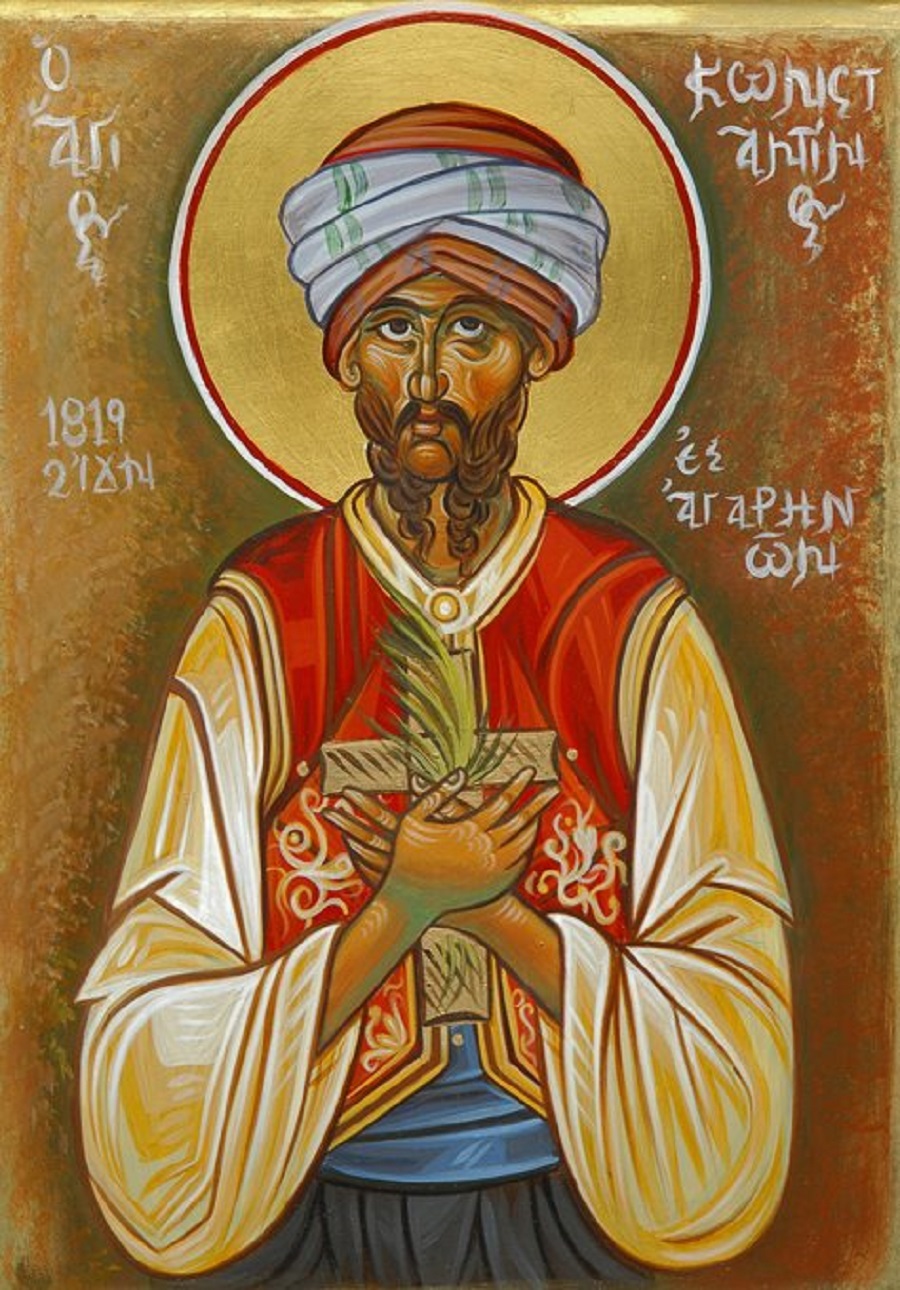 Ὅταν ἐπέστρεψε στή Σκήτη τῶν Καυσοκαλυβίων, ἐκμυστηρεύθηκε τόν πόθο του στόν πνευματικό του, ὁ ὁποῖος, εὐχαρίστως, ἀφοῦ ἄκουσε τήν ἀπόφαση τοῦ Κωνσταντίνου, ὑπέβαλε ἀμέσως αὐτόν στήν κατάλληλη προετοιμασία. Ὅταν αὐτή συντελέσθηκε, ὁ Κωνσταντίνος, συνοδευόμενος ὑπό τῶν εὐχῶν τοῦ πνευματικοῦ του καί τῶν συνασκητῶν του, ἀπῆλθε στήν Ἀνατολή, πρός ἐκπλήρωση τοῦ διακαοῦς πόθου του. Ἀποβιβάσθηκε στίς Κυδωνίες, ὅπου, κατά τή διάρκεια τῆς ἀναμονῆς πλοίου γιά τή Σμύρνη, ἐθεώρησε καλό νά ἐργασθεῖ σέ κατάστημα τροφίμων. Ἐκεῖ ὅμως ἀναγνωρίσθηκε ἀπό κάποιον Τοῦρκο συμπολίτη του καί καταγγέλθηκε στόν ἀγᾶ, ὁ ὁποῖος, ἀφοῦ συνέλαβε αὐτόν, τόν ἐρωτοῦσε περί τῆς ἀλήθειας ἢ μή τῶν καταγγελθέντων. Ὁ Κωνσταντίνος μέ θάρρος ὁμολόγησε ὅτι ναί μέν προηγουμένως ἦταν Μωαμεθανός, ἀλλά, ἐπειδή ἐφωτίσθηκε ἀπό τόν Θεό, ἔγινε Χριστιανός, διότι ἐπείσθηκε ὅτι ἡ πίστη αὐτή εἶναι ἡ μόνη ἀληθινή καί ἄμωμη. Ἐξοργισθείς ὁ ἀγᾶς, ἀφοῦ ὑπέβαλε τόν Κωνσταντίνο σέ παντοειδή βασανιστήρια, τόν ἀπέστειλε στήν Κωνσταντινούπολη, γιά νά ληφθεῖ ἐκεῖ ἡ ὁριστική ἀπόφαση περί αὐτοῦ. Ἀλλά καί ἐκεῖ ὁ Κωνσταντίνος παρέμεινε ἀκλόνητος στή Χριστιανική ὁμολογία του καί ἀπέρριψε ὅλες τίς γενόμενες σέ αὐτόν δελεαστικές προτάσεις. Κατόπιν τούτου, τό 1819, διατάχθηκε ἡ δι’ ἀπαγχονισμοῦ θανάτωσή του. Τό τίμιο λείψανο τοῦ Μάρτυρος, γιά νά μήν παραληφθεῖ ἀπό τούς Χριστιανούς, ἐνταφιάσθηκε κρυφά στό Τουρκικό νεκροταφεῖο, μεταξύ τῶν ἐκεῖ ἐνταφιασμένων Μωαμεθανῶν.