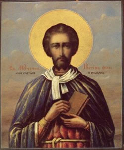 Φιλοσοφίας ταῖς ἀκτῖσιν ἐκλάμπων, θεογνωσίας ὑποφήτης ἐδείχθης, σοφῶς παραταξάμενος κατά τῶν δυσμενῶν· σύ γάρ ὡμολόγησας, ἀληθείας τήν γνῶσιν, καί Μαρτύρων σύσκηνος, δι’ ἀθλήσεως ὤφθης· μεθ’ ὧν δυσώπει πάντοτε Χριστόν, ὦ Ἰουστῖνε, ὑπέρ τῶν ψυχῶν ἡμῶν.