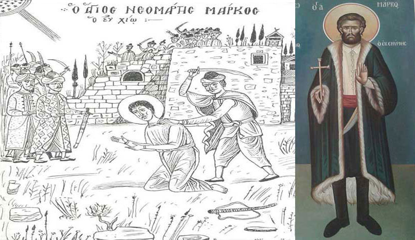 Ἅγιος Νεομάρτυς Μάρκος ἦταν γόνος τοῦ εὐσεβοῦς Θεσσαλονικέως Χατζῆ – Κωνσταντῆ καί τῆς Μαρίας, ἡ ὁποία καταγόταν ἀπό τή Σμύρνη, ὄπου καί διέμεναν. Ὁ Μάρκος, ἔμπορος στό ἐπάγγελμα, σέ κάποιο ταξίδι του στή νῆσο Χίο, κατά τό 1788, ἐνυμφεύθηκε. Ἀργότερα παρακινούμενος καί ἀπό τόν ἀδελφό του Παΐσιο, ἐγκαταστάθηκε στό Κουσάντασι (Νέα Ἔφεσο), ὅπου συνδέθηκε παράνομα μέ κάποια γυναίκα, ὀνομαζόμενη Μαρία, μετά τῆς ὁποίας συνελήφθη γιά μοιχεία, καί ὁδηγήθηκε στό δικαστήριο, ἐνώπιον τοῦ ἀγᾶ. Κάτω ἀπό τήν ἀπειλή τῆς ποινῆς προετίμησαν καί οἱ δύο νά ἐκωμόσουν. Ἔτσι ὁ μέν Μάρκος ὑπέστη τήν περιτομή, ἡ δέ Μαρία ἐκλείσθηκε στό χαρέμι τοῦ ἀγᾶ.