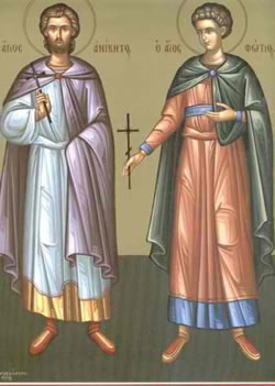Θείας πίστεως, τῇ συμφωνίᾳ, τήν οἰκείωσιν, τῆς συγγενείας, δι’ ἀγώνων ἱερῶν ἐλαμπρύνατε, θεομακάριστε Μάρτυς Ἀνίκητε, σύν τῷ Φωτίῳ φωτός τῷ θεράποντι. Ἀλλ’ αἰτήσασθε, δοθῆναι πταισμάτων ἄφεσιν, τοῖς μέλπουσιν ὑμῶν τήν θείαν ἄθλησιν.