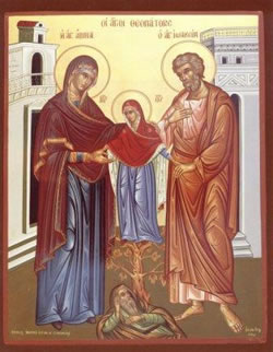 σύναξις τῶν δικαίων γονέων τῆς Ὑπεραγίας Θεοτόκου, σύμφωνα μέ τήν ἀρχαία ἐκκλησιαστική παράδοση ὁρίστηκε τήν ἑπομένη τοῦ γεννεσίου τῆς Θεοτόκου, γιά τόν λόγο ὅτι αὐτοί ἔγιναν πρόξενοι τῆς παγκόσμιας σωτηρίας μέ τήν γέννηση τῆς ἁγίας θυγατέρας τους. «Τελεῖται δέ ἡ σύναξις αὐτῶν ἐν τῷ ἐξαέρῳ οἴκῳ τῆς Θεοτόκου, πλησίον τῆς μεγάλης ἐκκλησίας ἐν τοίς Χαλκοπρατείοις».