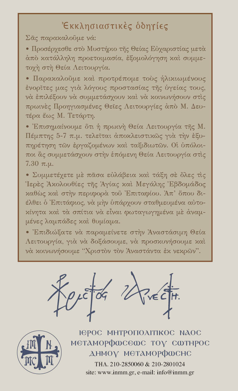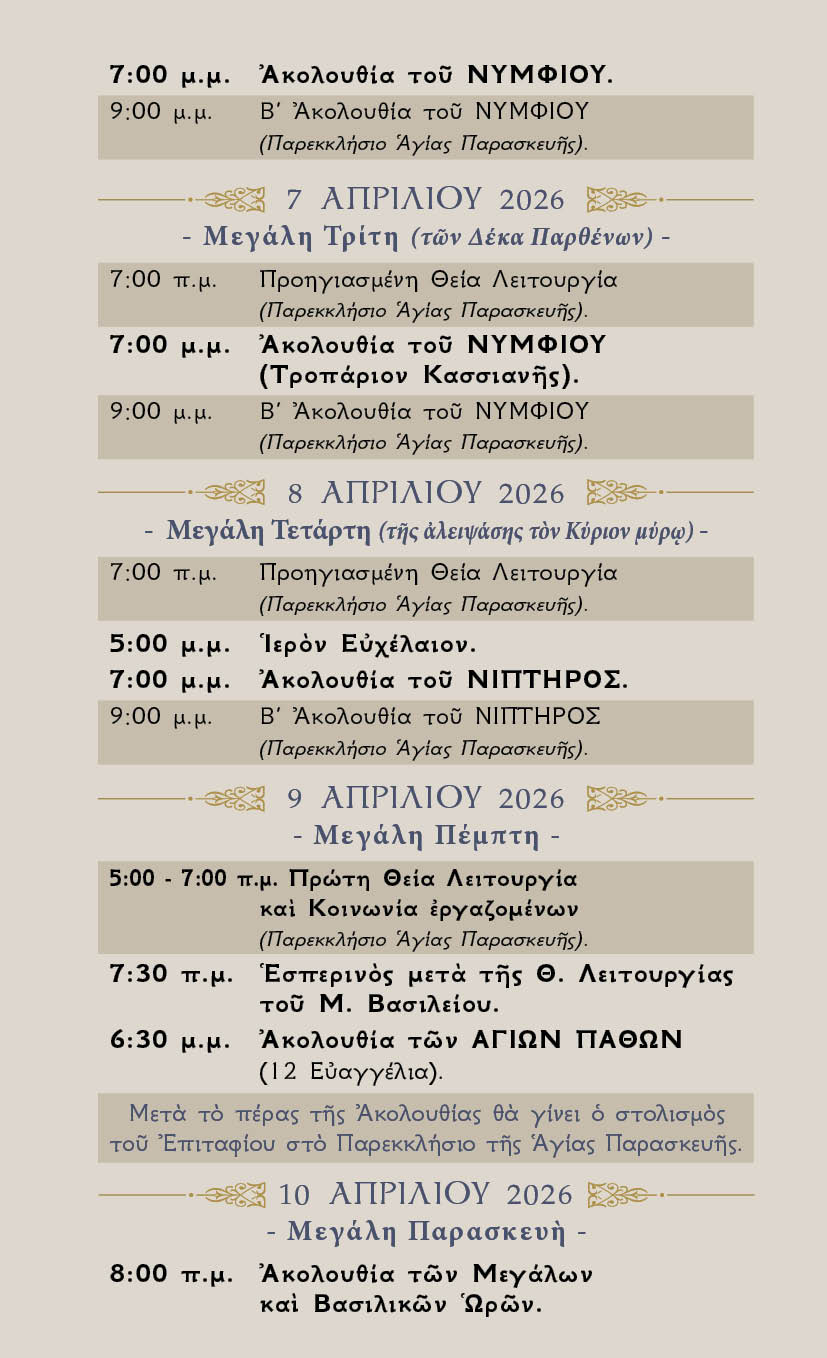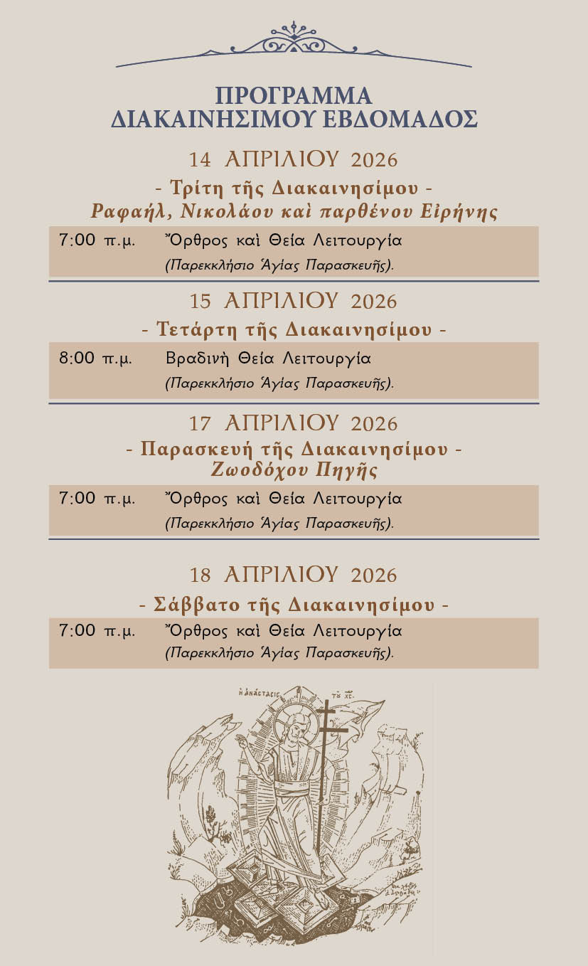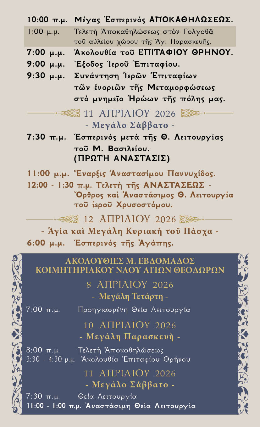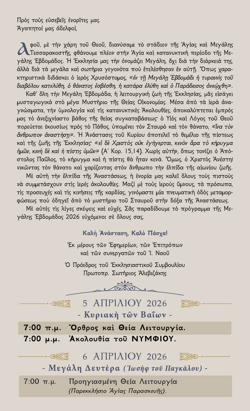 Κάνε κλικ εδώ για να κατεβάσεις Πρόγραμμα τῶν Ἱερῶν Ἀκολουθιῶν τῆς Μεγάλης Ἑβδομάδας καί τῆς Διακαινησίμου 2026