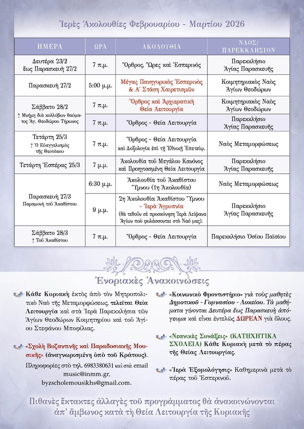Κάνε κλικ εδώ για να κατεβάσεις το πρόγραμμα τῶν Ἱερῶν Ἀκολουθιῶν τῆς Μεγάλης Τεσσαρακοστῆς γιά τό 2026 σε μορφή .pdf