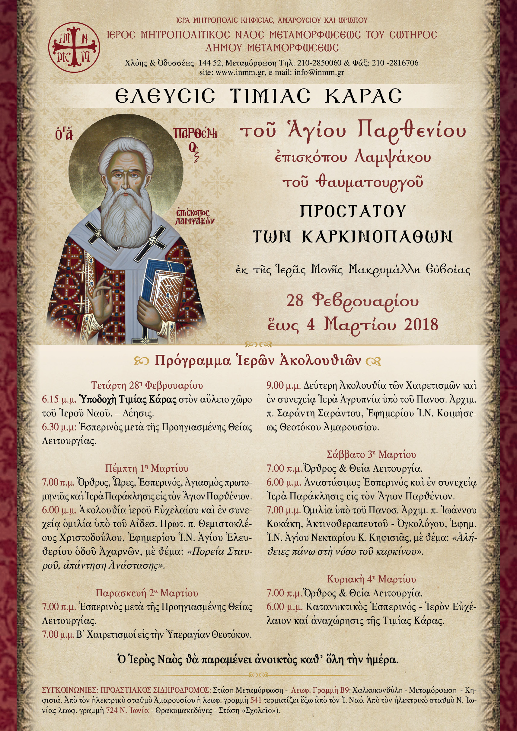 Κάνε κλικ εδώ για να κατεβάσεις το φυλλάδιο με πρόγραμμα των Ιερών Ακολουθιών επί τη ελεύσει της Τιμίας Κάρας του Αγίου Παρθενίου σε μορφή .pdf.