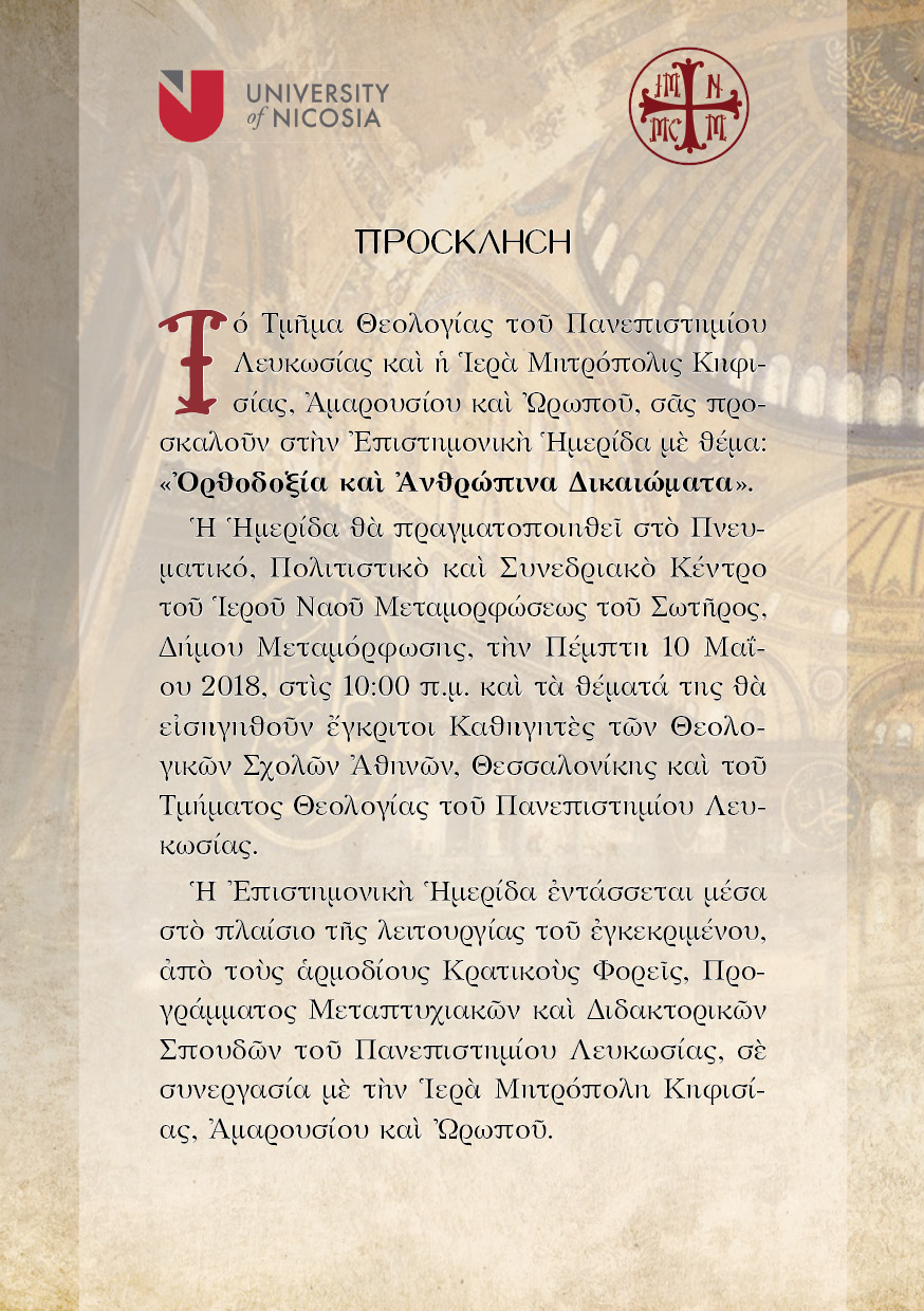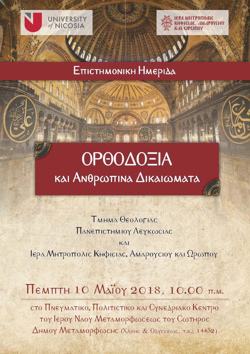 Επιστημονική ημερίδα με θέμα "Ορθοδοξία και Ανθρώπινα Δικαιώματα" πραγματοποιήθηκε σήμερα, 10 Μαΐου 2018, στο ανανεωμένο Πνευματικό, Πολιτιστικό και Συνεδριακό κέντρο του Ναού μας. Τη διοργάνωσή της ανέλαβαν το Τμήμα Θεολογίας του Πανεπιστημίου της Λευκωσίας και η Ι.Μ. Κηφισίας, Αμαρουσίου και Ωρωπού στο πλαίσιο της ευρύτερης συνεργασίας τους προς το σκοπό λειτουργίας προγράμματος Μεταπτυχιακών και Διδακτορικών Σπουδών.