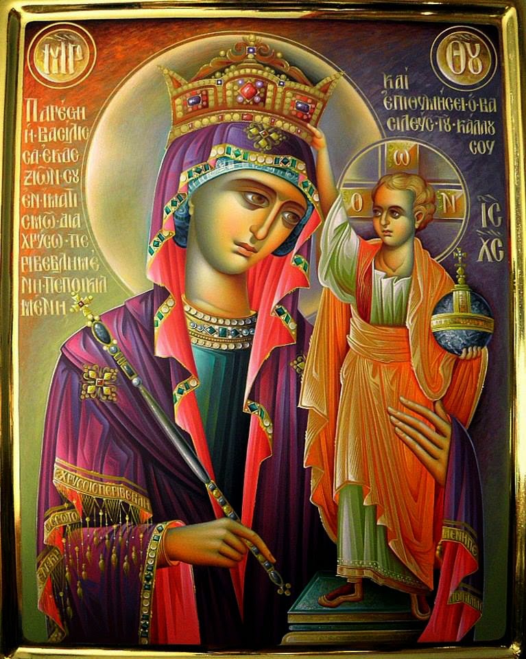 Τῆ σεπτῆ Σου Εἰκόνι τῆς Βασιλίσσης προσπίπτωμεν, κλίνοντες τό γόνυ, Παρθένε, τῆς ψυχῆς και τοῦ σώματος, δεόμενοι ἀντιλήψεως, Ἁγνή, πρεσβείαις προς Υἱόν Σου και λιταῖς. Ἵνα τύχωμεν, Παρθένε, τῆς παρ’ Αὐτοῦ πλημελημάτων ἀφέσεως. Δόξα τοῖς μεγαλείοις Σου, Σεμνή, δόξα τοῖς θαυμασίοις Σου, δόξα ὑπερβαλόντως, Κόρη, τῆ δυναστείᾳ Σου.